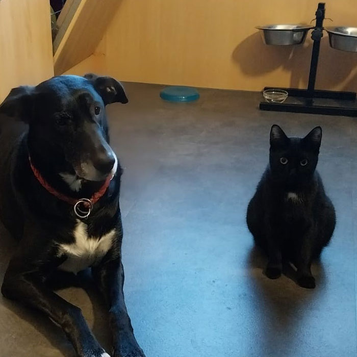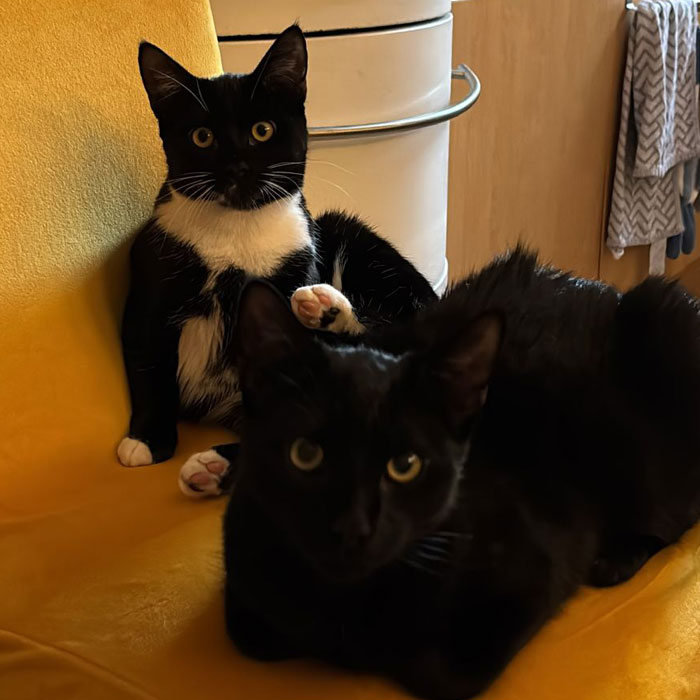 Chloé und Chester haben völlig verschreckt mit großen Augen zu uns. Mit Ruhe und Geduld ist aber vor allem Chester zu einem absoluten Schmusebär geworden. Auch Chloé wurde immer entspannter, sodass die beiden gemeinsam ein neues Zuhause gefunden haben.